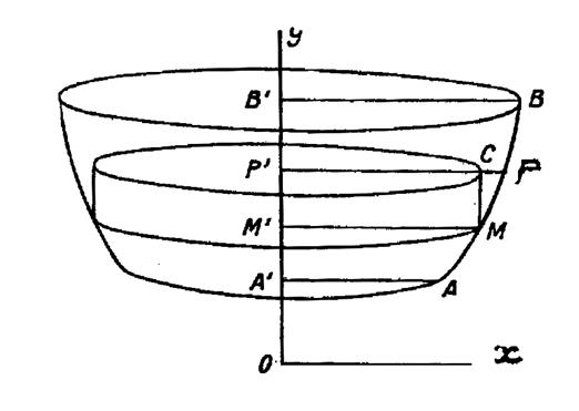 Considérons une courbe « y » f( x ) qui tourne autour de l’axe « Oy » (voir ci contre). L’aire limitée par la courbe « 0y » et