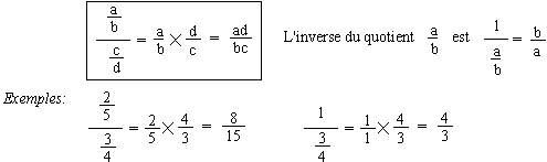 c'est à dire que l'un des quotients est le dividende (ou le numérateur) l'autre le diviseur (ou le dénominateur). Le quotient de a/b (dividende) par c/d (diviseur) est le produit de a/b par l'inverse de c/d (c'est à dire par d/c).