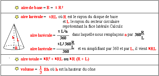 Nous avons vu, lors de l'étude du patron du cône, que l'angle au centre a du secteur circulaire (face latérale du cône) est donné par a=360.(R/L) où R est le rayon du disque de base et L le rayon du secteur circulaire représentant la face latérale.
