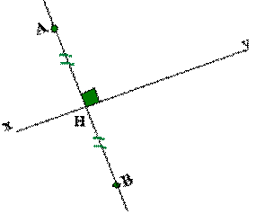 Nous devons obtenir la figure ci-contre. Pour cela il faut que l'axe (xy) soit perpendiculaire au segment [AB] en son milieu (puisque (xy) doit être la médiatrice de [AB]):