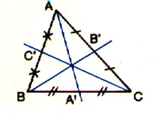 détermination graphique de la position du centre de gravité du triangle ( 1/3 et 2/3) |