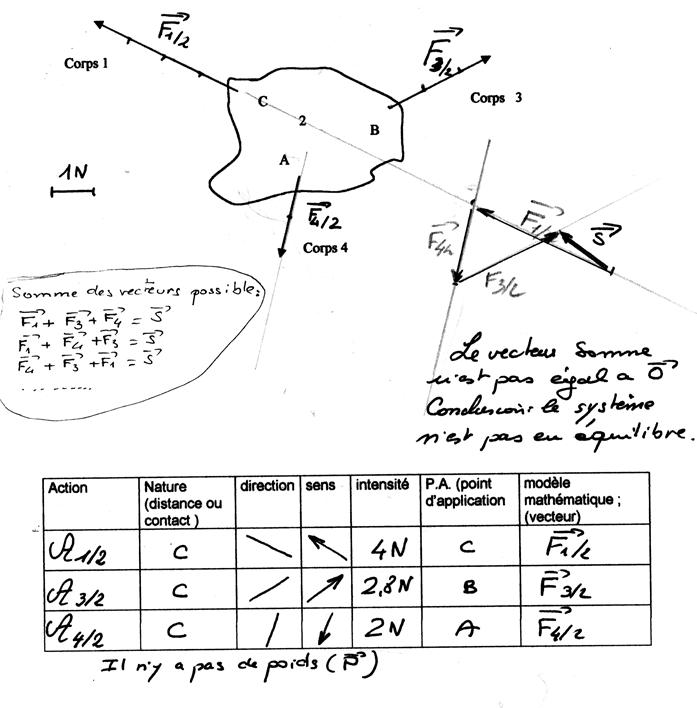 b) tracer et compléter le tableau regroupant les caractéristiques des forces